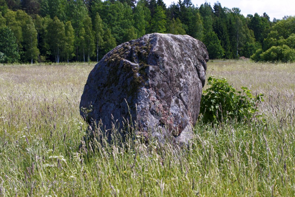 Klajā vietā, pļavā, netālu no Āžiem, nepilnus 100 m no Āžu–Nevejas ceļa, Dundagas novads.