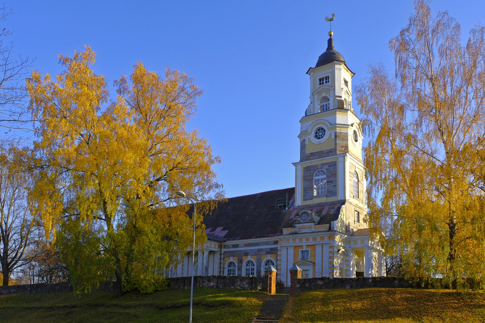 Baznīcas torņa augstums 55,5 metri. No 1786. gada torņa smailē uzstādīts gailis, ko vietējie ļaudis izmanto arī kā laika apstākļu prognozētāju. Tornī augšup ved platas ozolkoka kāpnes, kas nav raksturīgas nevienai citai baznīcai. Iespējams, kāpnes uzceltas gleznainās apkārtnes dēļ, lai barons to varētu izrādīt viesiem.
