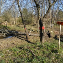 Marķējums: Zaļas lentītes, oranžs marķējums uz kokiem un norādes zīmes ar pēdiņām.